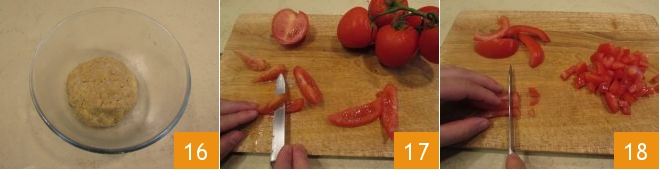 Mix until you obtain a homogeneous mixture 16, cover with plastic wrap, and let it rest in the refrigerator. Meanwhile, prepare the sauce. Wash the tomatoes, cut them into wedges, and remove the seeds 17, then cut them into cubes 18.