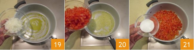 Chop the onion and transfer it to a pan with oil 19. Let it soften for a few minutes over medium heat 20 and also add the tomatoes. Sprinkle them with sugar and let them caramelize for a couple of minutes 21.