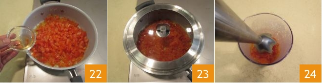 Deglaze with rice vinegar 22, cover with a lid 23, and let it cook for about 25 minutes, stirring occasionally. Transfer everything to the blender's glass and blend 34,