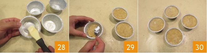 Take the disposable molds and grease them 28, then fill them with the mantis shrimp mixture 29 and level the top with the help of a spoon 30.