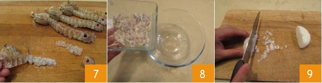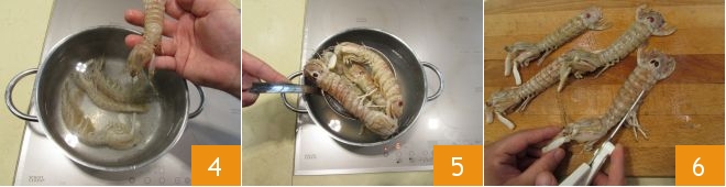 Meanwhile, boil the mantis shrimps for 2-3 minutes 4, drain them 5, let them cool, and proceed with the How to clean mantis shrimp. Cut the appendages on the belly and trim the sides 6.