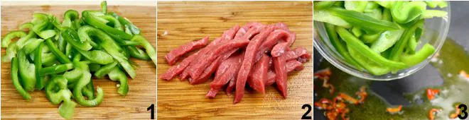 To prepare the spicy beef, start by washing a bell pepper, cut it in half, remove the stem and seeds and slice it into fairly thin strips 1. Also cut the meat into strips about 0.4 inches wide 2 and 2 inches long. Then chop the two chili peppers that you have halved to remove the internal seeds. Heat the oil and chili in a wok and add the pepper strips 3, salt and pepper and cook for about 10-15 minutes.