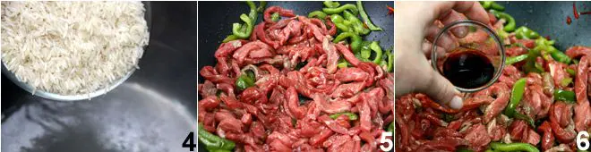 In the meantime, you can bring a pot of water to a boil and then pour in the basmati rice 4. After the pepper cooking time has elapsed, add the beef strips 5, sauté them until they are cooked, seasoning with 6 tablespoons of soy sauce 6.