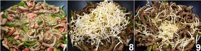 Carefully mix, being cautious not to break the peppers 7. Once the beef is cooked, remove the wok from the heat, add the chopped chives 8 and bean sprouts 9, mix everything and drain the basmati rice. Serve the spicy beef with the rice and optionally add more soy sauce to taste. To enrich the spicy beef with basmati rice, you can add a tablespoon of toasted sesame seeds to release their aroma.