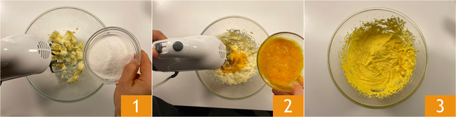 To prepare the marbled pound cake with caramel and nuts, start with the batter: in a bowl, use electric beaters to work the softened butter at room temperature, adding the lemon zest and sugar 1. It will take about 10 minutes for the mixture to become frothy. Gradually add the eggs (slightly beaten), while continuing to work with the beaters 2, and you should obtain a whipped and homogeneous mixture 3.