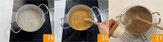 Cook without stirring, until boiling 19 or if you need to stir, use a wooden spoon. When it turns a beautiful amber color 20, proceed to remove it from the heat and pour in the liquid fresh cream at room temperature, a little at a time 21. In this phase, we recommend being careful as the thermal shock might cause it to boil vigorously.