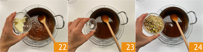 Once you've finished adding the cream and mixing the ingredients, you can pour in the butter off the heat 22, stir and add salt 23 then the nuts 34.