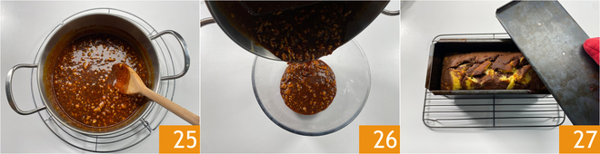 Then you can unmold and let it cool on a rack 28, then pour the caramel with nuts over the entire pound cake, making sure to place a tray under the rack, so as to collect the excess that will not remain on the dessert 29. Wait for it to set. Your marbled pound cake with caramel and nuts is ready to be enjoyed!
