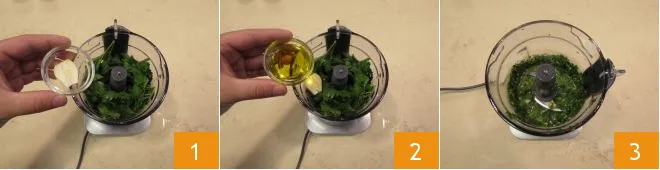 To prepare the marinated anchovies, start with the marinade: in a mixer, add the parsley along with a clove of garlic 1, and 3 tablespoons of olive oil 2, and blend everything for a few moments 3.