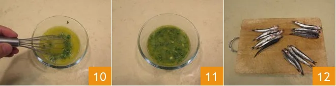 Continue mixing with the whisk 10, then set aside the marinade 11. Meanwhile, proceed to the How to Clean Anchovies 12; since these will not undergo any cooking, it is very important to ensure they have been properly frozen at the time of purchase (always choose fresh anchovies to buy at your trusted fish market); for greater safety, it is recommended to freeze for at least 96 hours at 0°F (-18°C) (already gutted) and then thaw to use in the recipe.