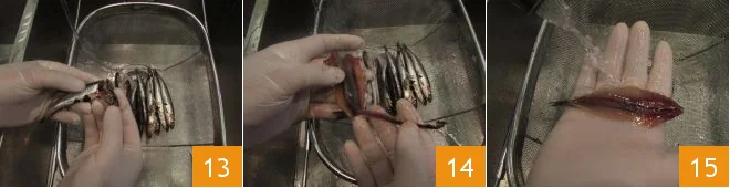 Wear disposable latex gloves, then remove the head 13, then run your thumb along the belly to open them like a book, so you can then bone them by pulling away the central bone and cleaning out the innards 14, finally rinse the fillets under a stream of water (to remove all impurities), being very careful not to split the fish into two halves 15.