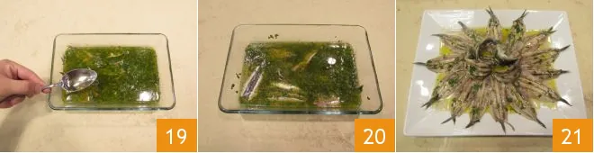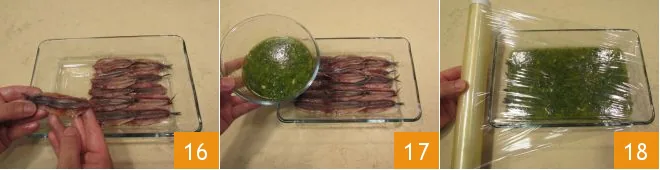 Arrange the well-cleaned anchovy fillets in a large container side by side 16 and pour the marinade you prepared 17, then cover with plastic wrap. Leave to rest for at least 5 hours at room temperature 18.