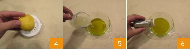 Squeeze the lemons 4, and collect the juice in a container with the olive oil 5 and season with salt and black pepper 6.