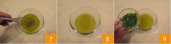 Mix well using a whisk 7 or the tines of a fork, and when the two mixtures have combined 8, add the parsley mixture 9.