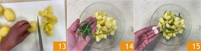 Then cut them into large cubes 13 and transfer them to a bowl. Add the rosemary 14 and garlic 15.