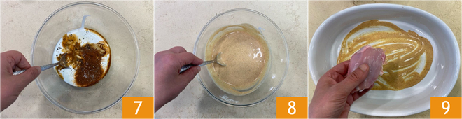 To prepare marinated chicken, first pour the yogurt into a bowl. Add the mustard 1, soy sauce 2, and lemon juice 3.