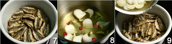 Arrange the anchovies in a container 7. In a saucepan, place the vinegar, white wine, salt, onion cut into wedges, chili pepper sliced, and garlic cut in half (or sliced) 8. Bring slowly to a boil, then cook for 2-3 minutes and turn off the heat; pour the hot vinegar mixture over the anchovies until covered 9, then let them marinate for at least 12 hours in a cool place.
