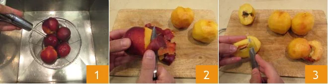 To prepare peach jam, start by choosing the fruits: pick well-ripened peaches with firm flesh, wash them under running water 1, peel them 2, and remove the pits 3.