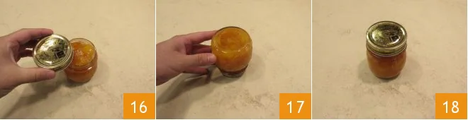 Screw the lids on tightly 16, but not too tight, and let them cool. You can turn them upside down 17 or skip this step: thanks to the heat, a vacuum will still form, allowing the product to be preserved for a long time. Once the jars have cooled, check if the vacuum has been created correctly: you can press the center of the lid, and if you don't hear the typical "click-clack," the vacuum has been created 18. Your peach jam is ready to be enjoyed!