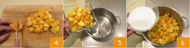Cut them into cubes about 3/4 inch 4, put them in a pot 5, and add the sugar 6.