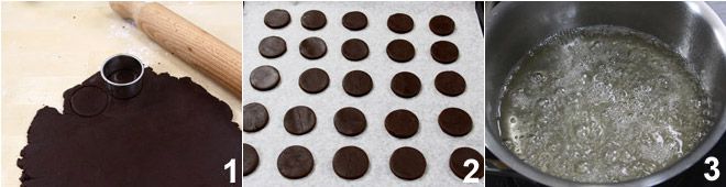 To make the marshmallow ghosts, start by preparing the cocoa shortbread cookies that will serve as the base for the ghosts (see how to prepare the cocoa shortbread by clicking here). Roll out a 1/8 inch thick sheet with a rolling pin and then, with a round pastry cutter with a diameter of 1.5 inches, cut out about 40 discs 1 which you will bake in a preheated oven at 350°F for about 12-15 minutes 2. Let the cookies cool completely.
