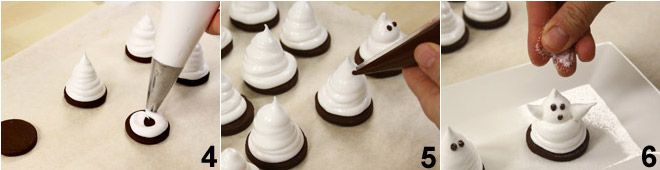 While the sugar is cooking, beat the egg whites with the salt and the vanilla bean seeds, when they are white and foamy, slowly add the cooked sugar at 250°F, and then the gelatin, continuously beating until the mixture is cool. Put the mixture into a pastry bag with a large round tip and then squeeze out a ghost about 2-2.5 inches high onto each cookie 4. Using melted dark chocolate, create the eyes and mouth on the ghosts 5, then sprinkle them with superfine granulated sugar 6.