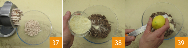 Well, at this point, you have all the components for the filling. Pass the pork roast, brains, and stew through a meat grinder 37. Add the chopped aromatic herbs, grated Grana Padano DOP 38, salt, pepper, a pinch of nutmeg, and grated lemon zest 39.