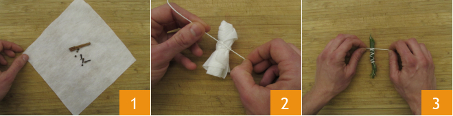 To prepare marubini you need to set up the preparations properly. Let's start with the beef stew. Place the cinnamon, cloves, and pepper in a cheesecloth 1, close and tie it with kitchen twine 2. Then also tie rosemary and bay leaves 3.