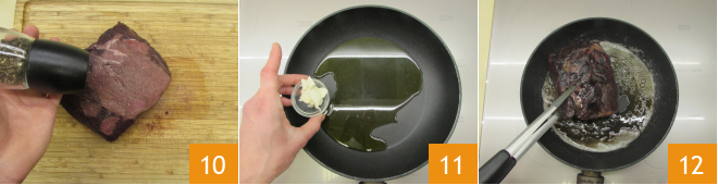 Salt and pepper the surface 10 and move to the stove. Heat some oil and butter in a pan 11, add the meat and let it brown well on all sides, turning with tongs or two wooden spoons 12.