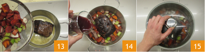 In a large saucepan, transfer the meat with all its fat, add the vegetables with the aromas and let them brown for a few minutes just until the vegetables lightly toast 13. At this point, add the wine set aside 14, cover with a lid, and continue cooking over low heat, it should gently simmer, for about two and a half hours; turn occasionally 15.