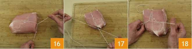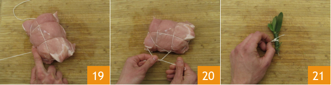 Move on to the pork roast. The first thing to do is to tie the meat with string, it will help keep the shape during cooking. To do this, pass the string under the piece of meat and fix it at one point 16. Create a loop with one hand and with the other, cage the piece of meat 17. Arrange the first loop all around the piece of meat 18