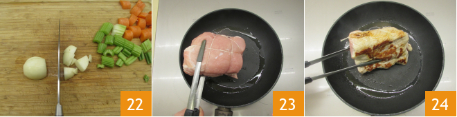 Coarsely chop cleaned celery, carrots, and onions 22 and move to the stove. Heat a little oil in a pan and place the tied loin 23. With the help of tongs or two wooden spoons, brown it on all sides until it has a nice color 34.