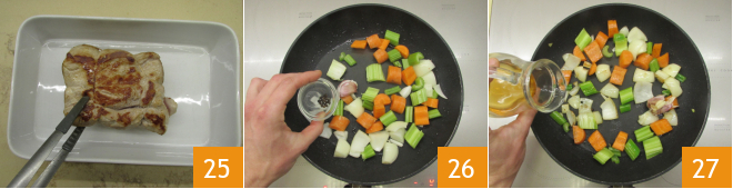 Move the browned meat to a baking dish 25 and meanwhile, in the same pan, brown the vegetables, adding the clove of garlic in its skin and the peppercorns 26. Let them toast over high heat for a few minutes, then deglaze with the wine, and when the alcohol evaporates, pour in the water, cooking for a few more moments 27.