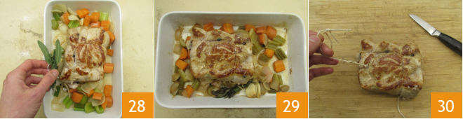 Transfer everything to the baking dish, adding the aromatic bouquet 28 and cook in the oven at 350°F for about an hour until it reaches a temperature of about 160°F at the center 29. At the end of cooking, just remove the kitchen string using scissors or a small knife 30.