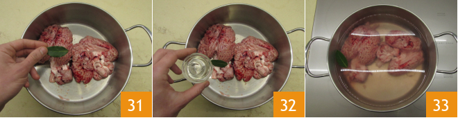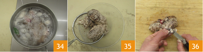 Place the brains in a pot, add the bay leaf 31 and vinegar 32, cover with plenty of cold water 33,