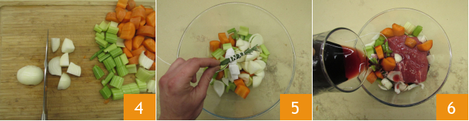 Clean and coarsely chop the carrots, celery, and onion 4, transfer them to a container with the aromas 5 and the meat. Then pour the wine 6,