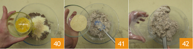 Also add the egg 40 and start mixing with a spatula, then add the breadcrumbs 41 and give it another mix before transferring the mixture into a piping bag. Let it rest in the refrigerator for at least an hour to firm up and flavor thoroughly 42.