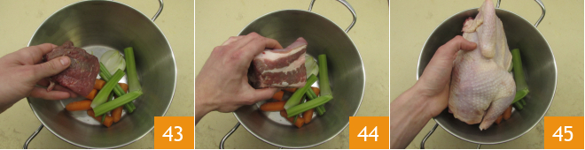 Now let's move on to the preparation of the broth. In a large pot, add cleaned and coarsely chopped celery, carrots, and onions. Add the beef muscle 43, brisket 44, and half chicken 45.