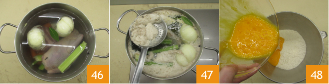 Add the bay leaf, juniper berries, and cloves, pour water to cover 46. Cook for at least a couple of hours, remembering to skim; at the end of cooking, strain the broth from the meat and vegetables 47. Meanwhile, prepare the egg pasta. If you want, you can knead by hand or, to speed up, with the mixer. In the bowl of a mixer, pour the flour and eggs 48.