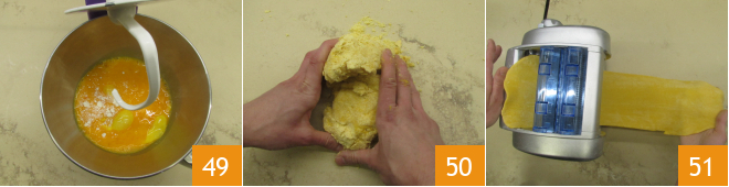 mix by using the hook 49 and when the ingredients are combined, transfer to the work surface, compacting well to obtain a dough ball to rest in the refrigerator for at least half an hour, wrapped in cling film 50. After the time, lightly dust the dough ball and roll it out with the machine or rolling pin, passing the dough several times until you get a thin sheet about 0.5mm 51.
