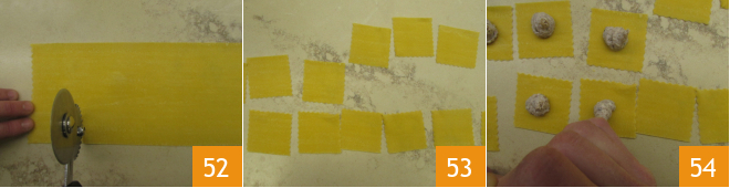 With the help of a fluted cutter 52, obtain squares of about 2.5 inches x 2.5 inches 53, place the filling in the center of the squares 54.