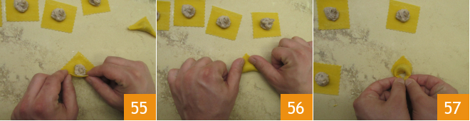 Slightly moisten the edges of the pasta with water and adhere well to the two edges towards you, bringing them to the opposite side 55. Obtain a sort of triangle and close it well with your fingertips; performing this operation on the work table will be easier 56. Join the two ends to obtain the typical 'belly button' shape 57.
