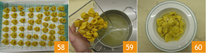 As you make the tortellini, place them on a clean cloth laid inside a tray 58. When the broth and tortelli are finally ready, make sure the broth is seasoned to your taste, and then cook the marubini 59. After a few minutes, they will float to the surface, serve them with the broth and enjoy your meal 60.