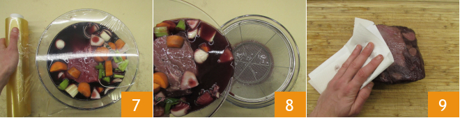 cover with cling film and marinate for about 12 hours in the refrigerator 7. After the marinating time, drain everything without throwing away the wine 8 and dry the piece of meat with paper towels 9.