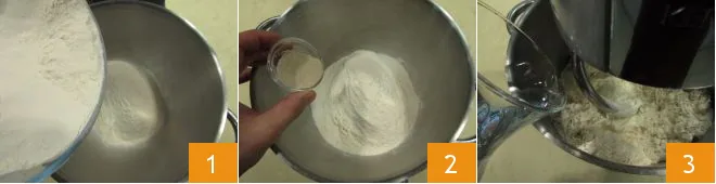 To prepare the pizza dough, start by pouring the flour into the stand mixer's bowl 1. Add the yeast 2 and 3.5 oz of water, then start the mixer with the hook attachment at a medium-low speed 3.