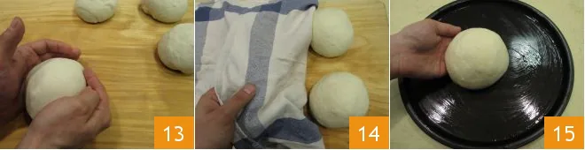 Form each piece into a ball 13. Cover with a clean cloth and let rest for 30 minutes 14. Lightly oil 4 pizza pans of 12 inches in diameter. Place a dough ball in the center of the pan 15.