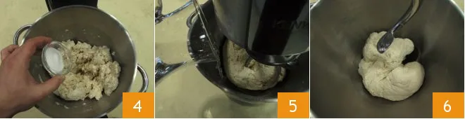 Continue adding the water slowly, making sure the previous amount is well absorbed by the flour 4. Once about 3/4 of the water is added, add the salt 5 and continue kneading. Add the remaining water slowly and let it work until you get a smooth and homogeneous mixture 6.