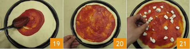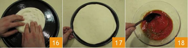 and start pressing from the center towards the edges, stretching the sides slightly if necessary 16. If the dough is too elastic and tends to return to its original shape, set aside the pizza you are stretching and proceed to stretch another, allowing the previous one to rest. Try to stretch the dough across the entire surface of the pan 17. Separately, in a large bowl, pour the tomato sauce and season it with salt, oil, and oregano 18.