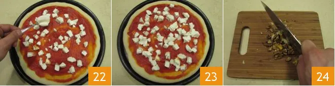 Now add the mascarpone with a teaspoon 22. Let the filled pizza rest for about ten minutes 23 and bake at 482°F for 12/15 minutes in a static oven (otherwise, about ten minutes at 446°F in a fan oven will be enough). Meanwhile, lightly chop the walnuts with a knife 34.