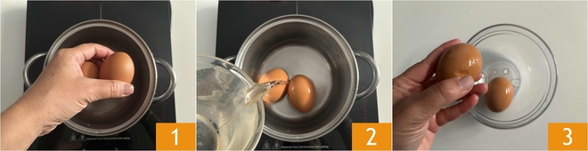 At this point, gently remove the shell 4 from both eggs 5 and cut them in half 6.